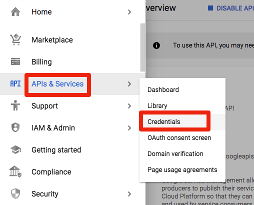 Now click "APIS and Services" then "Credentials" in the left column to go to the credentials dash: