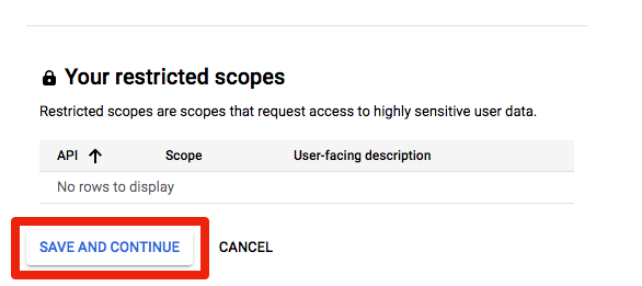 Click "SAVE AND CONTINUE" on the scopes screen: